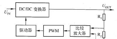 其中DC/DC變換器用以進行功率轉換,它是電源適配器的核心部分,此外還有啟動、過流與過壓保護、噪聲濾波等電路?輸出采樣電路(R1?R2)檢測輸出電壓變化,并與基準電壓U,比較誤差電壓經過放大及脈寬調制(PWM)電路,再經過驅動電路控制功率器件的占空比,從而達到調整輸出電壓大小的目的。